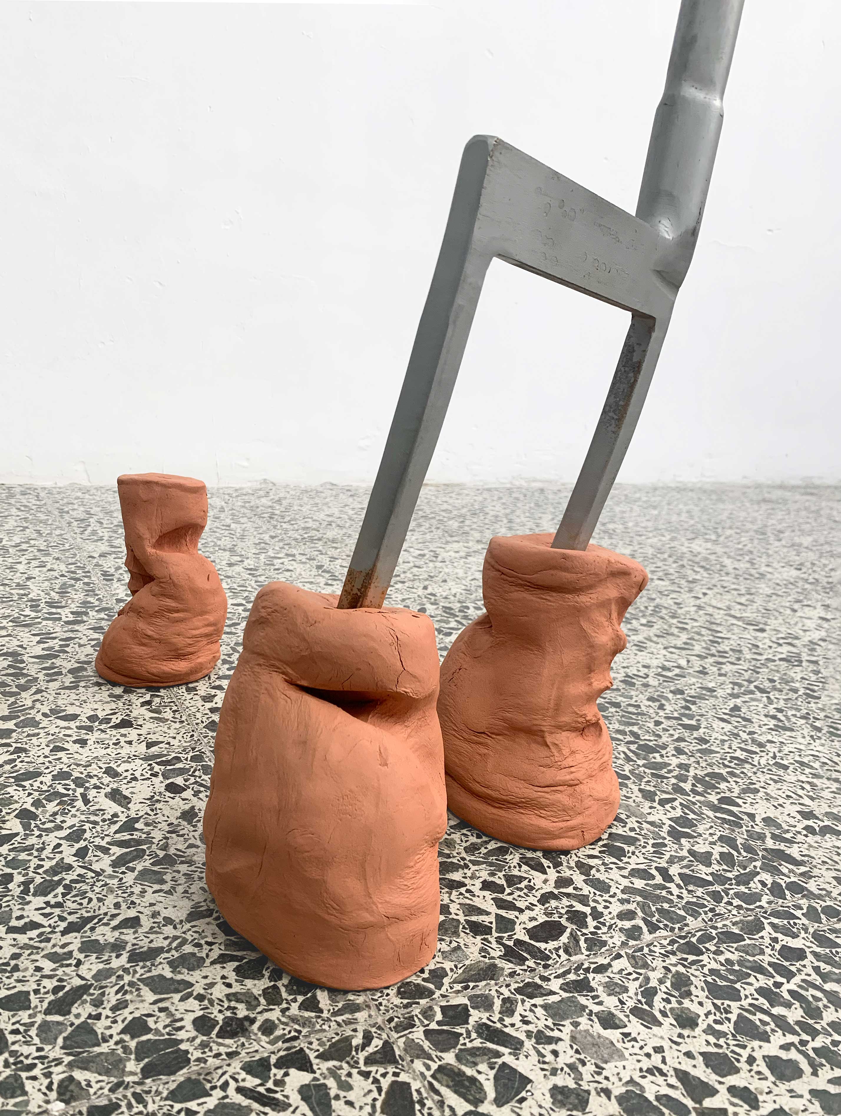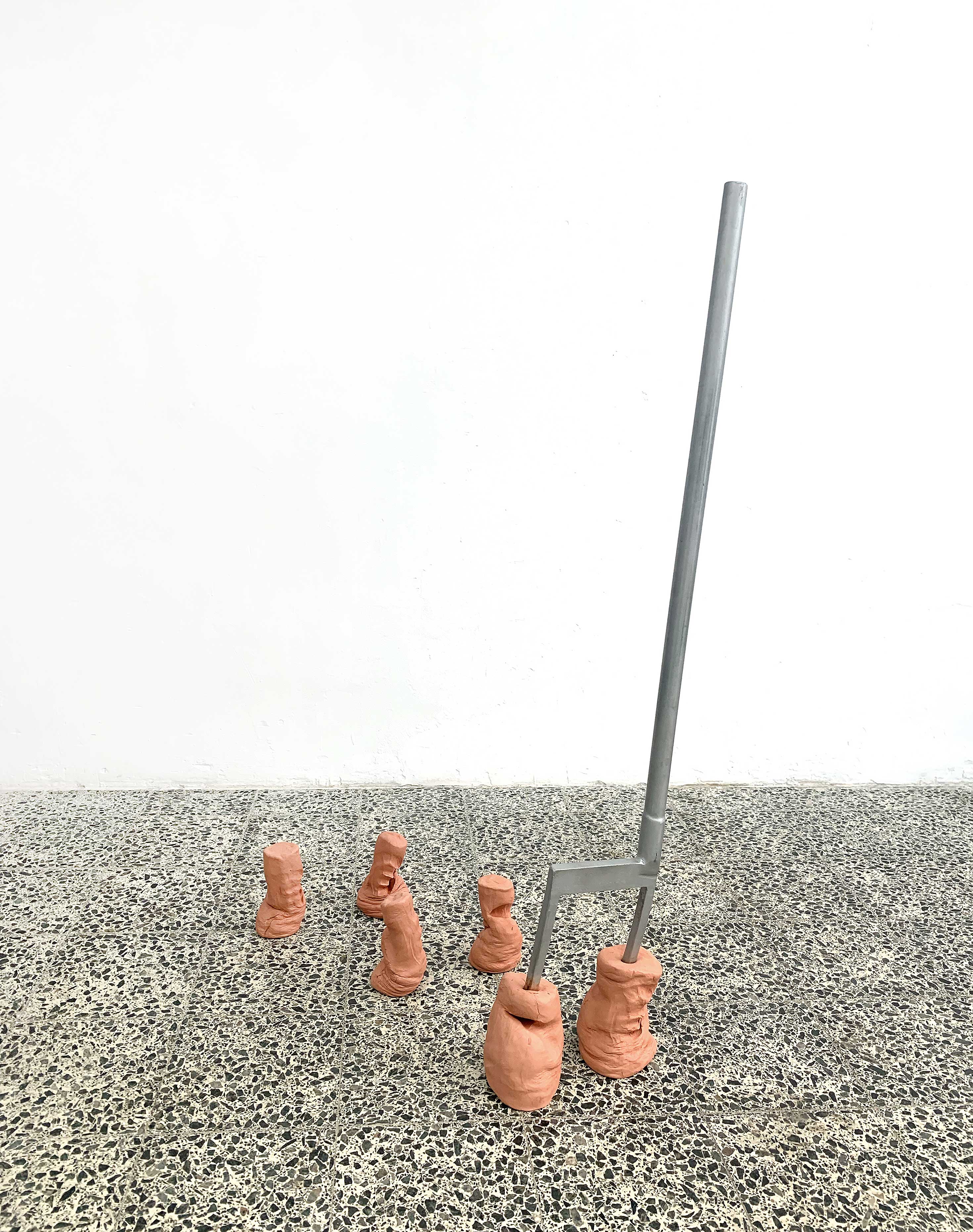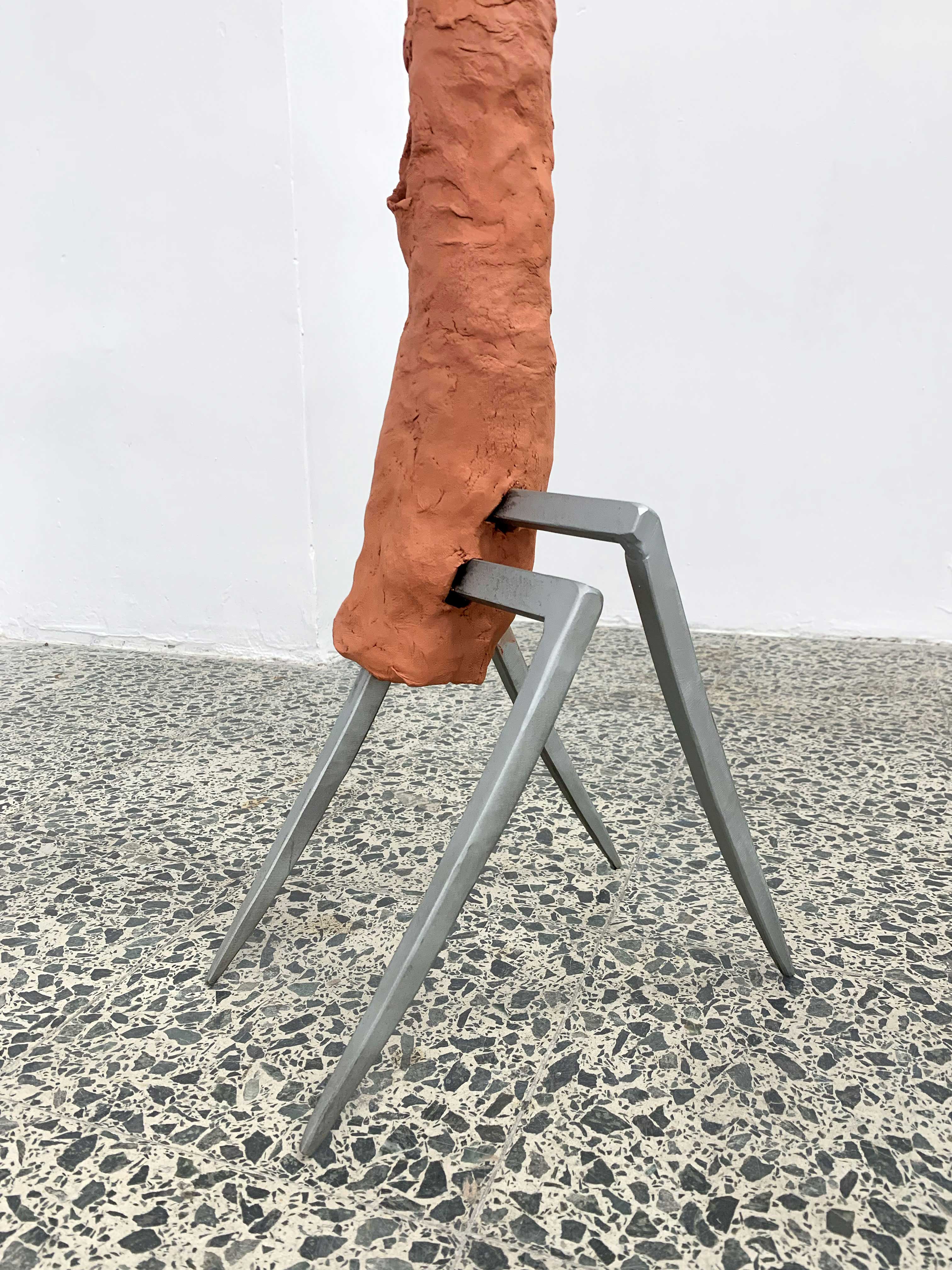 Laia II, 2026. Painted iron and clay. 123 × 23 × 31 cm.