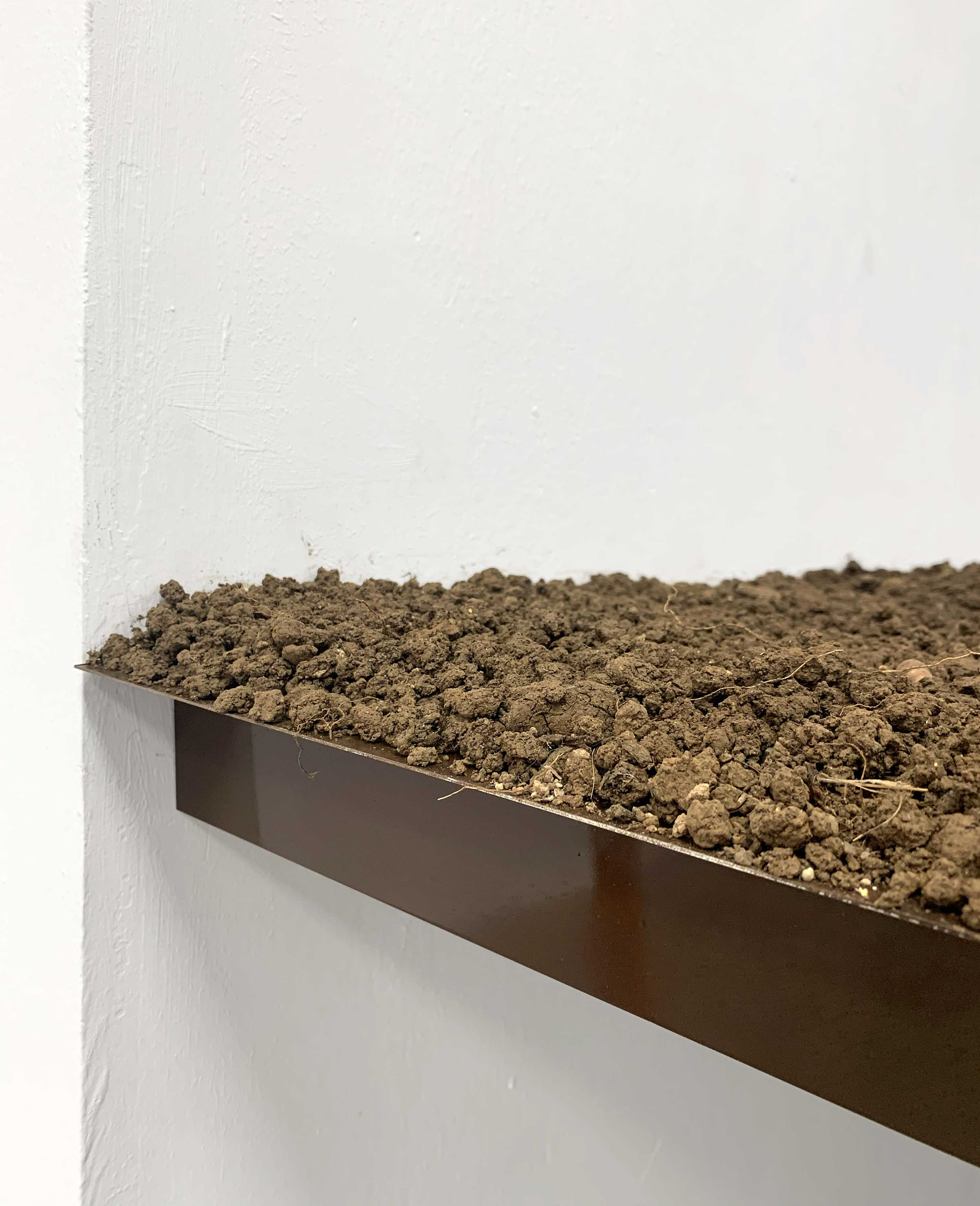 Adaptative modular structure made of pine wood, water-resistant panels and metal profiles, incorporating soil from Madrid, Burgos, Araba and Bizkaia. 320 x 400 cm. Technical assistance: Gonzalo del Val Architecture Studio