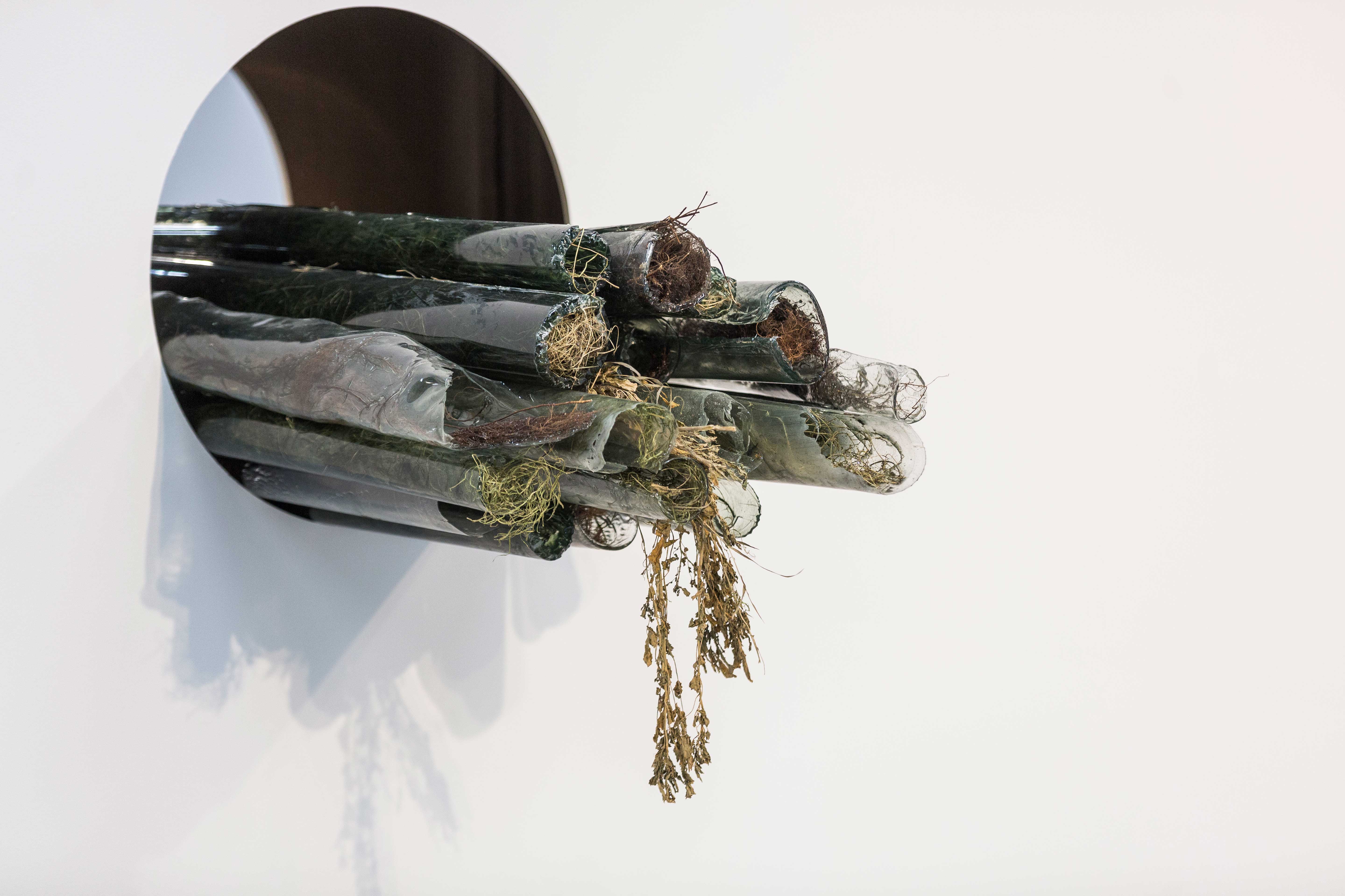 Recolectar y Amontonar, 𝟤𝟢𝟤𝟧. Installation, Riparian plants and plant-based resin: 50 x 50 x 160 cm. Technical assistance Marta Lorenzana